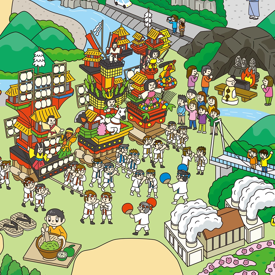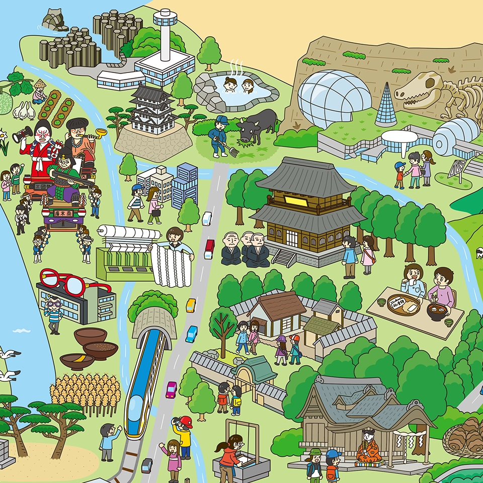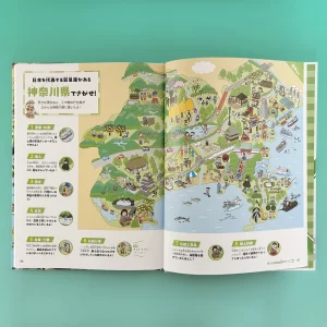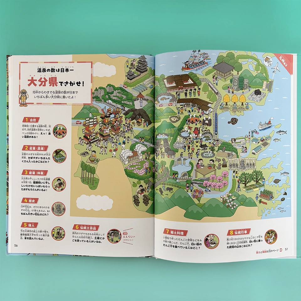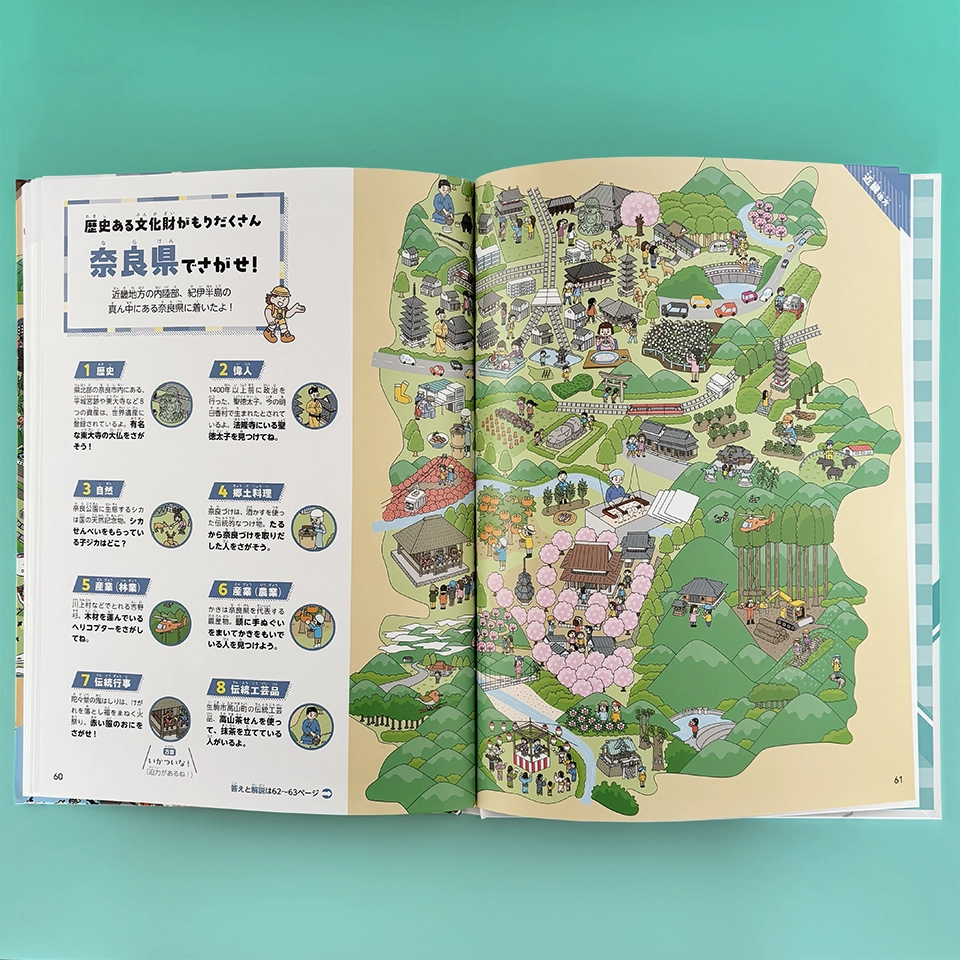 図書館用特別堅牢製本図書「にっぽん中のスゴイ!が見つかる 絵さがし都道府県」(ポプラ社)全3巻で神奈川県、福井県、愛知県、大阪府、奈良県、大分県のイラスト制作を担当しました。絵さがしをしながら都道府県の特徴を学ぶ内容になっています。