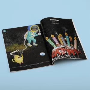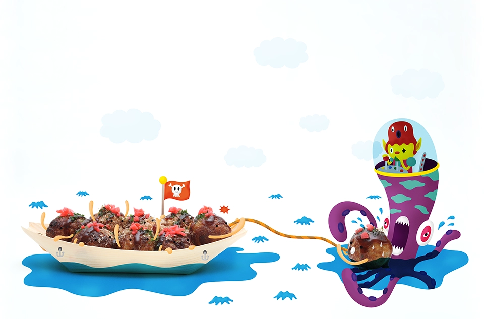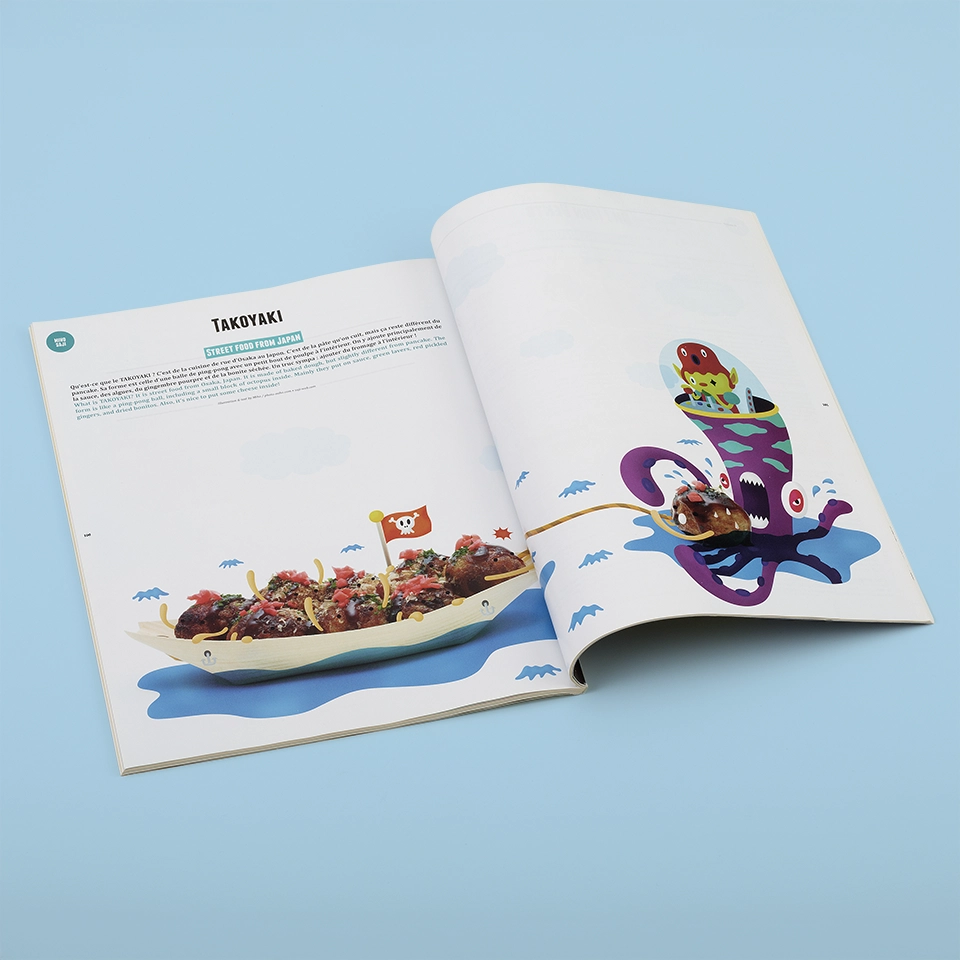 フランスのフードがテーマの雑誌「fricote」マガジンでイラストを作成しました。たこ焼きとケーキの写真にイラストを合成させています。